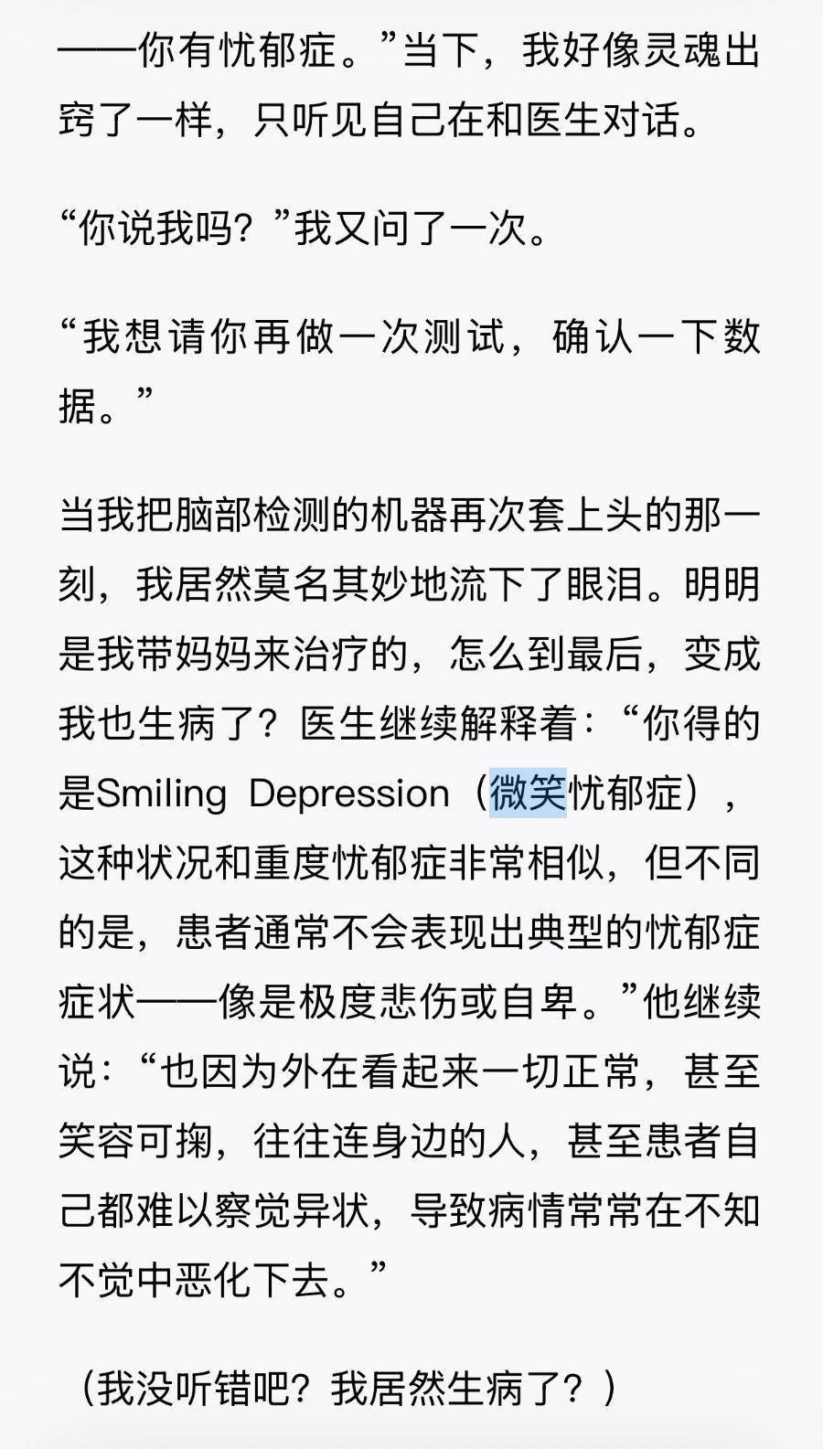 罗志祥在书中自述,陪母亲治疗期间,他经脑部检测被确诊为Smiling Depression(微笑忧郁症)。医生当时解释,这种病症与重度忧郁症症状相似,但患者不会表现出极度悲伤、自卑等典型忧郁症状,反而外表看起来正常甚至笑容可掬,这使得身边人乃至患者自身都难以察觉,容易导致病情在不知不觉中恶化下去。